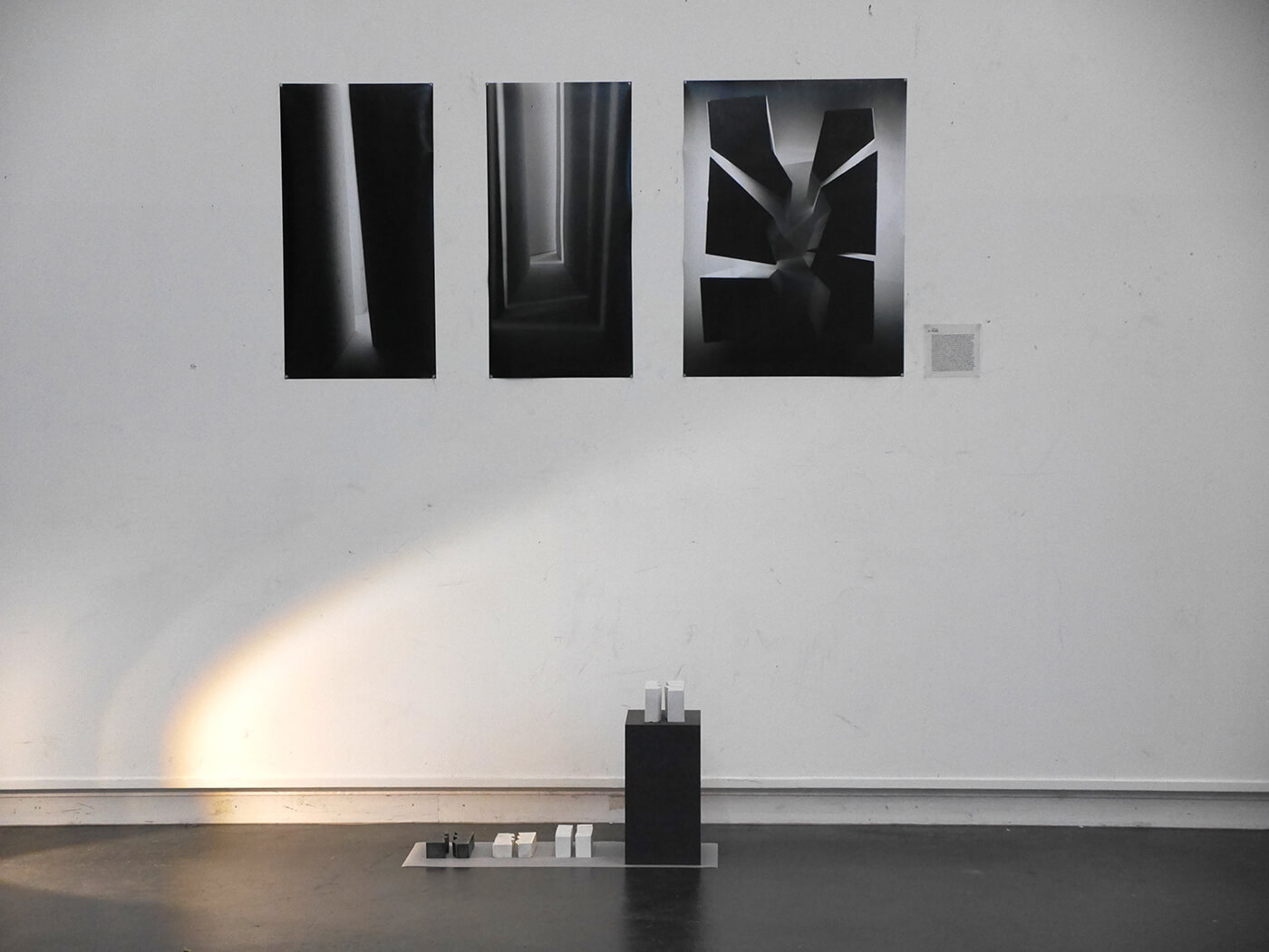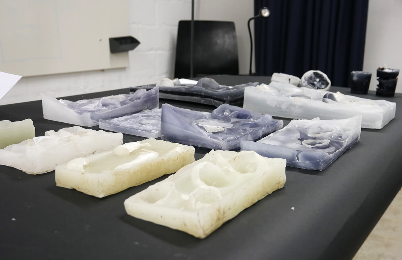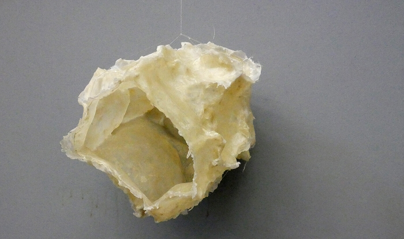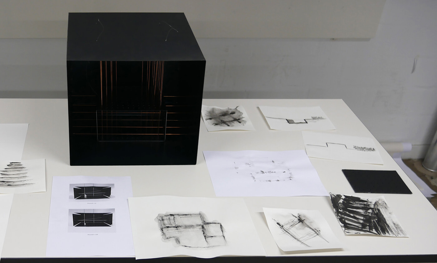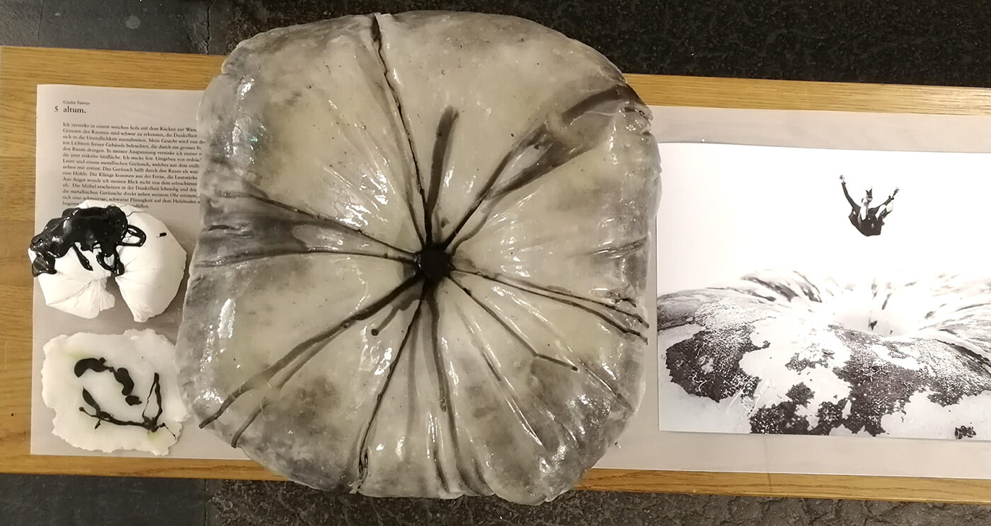 Gelatinehäuser, die zwischen den Zähnen knirschen – schwebende Höhlen – der Raum unter dem Klavier, der sich als Universum entpuppt – abgelagerte Zeitschichten in langen Gängen – Untersuchungen der Dunkelheit und Studien zu Licht– ein Kachelofen, der Harze verfeuert – zerfliessende, zerdrückte, sich auflösende Räume.