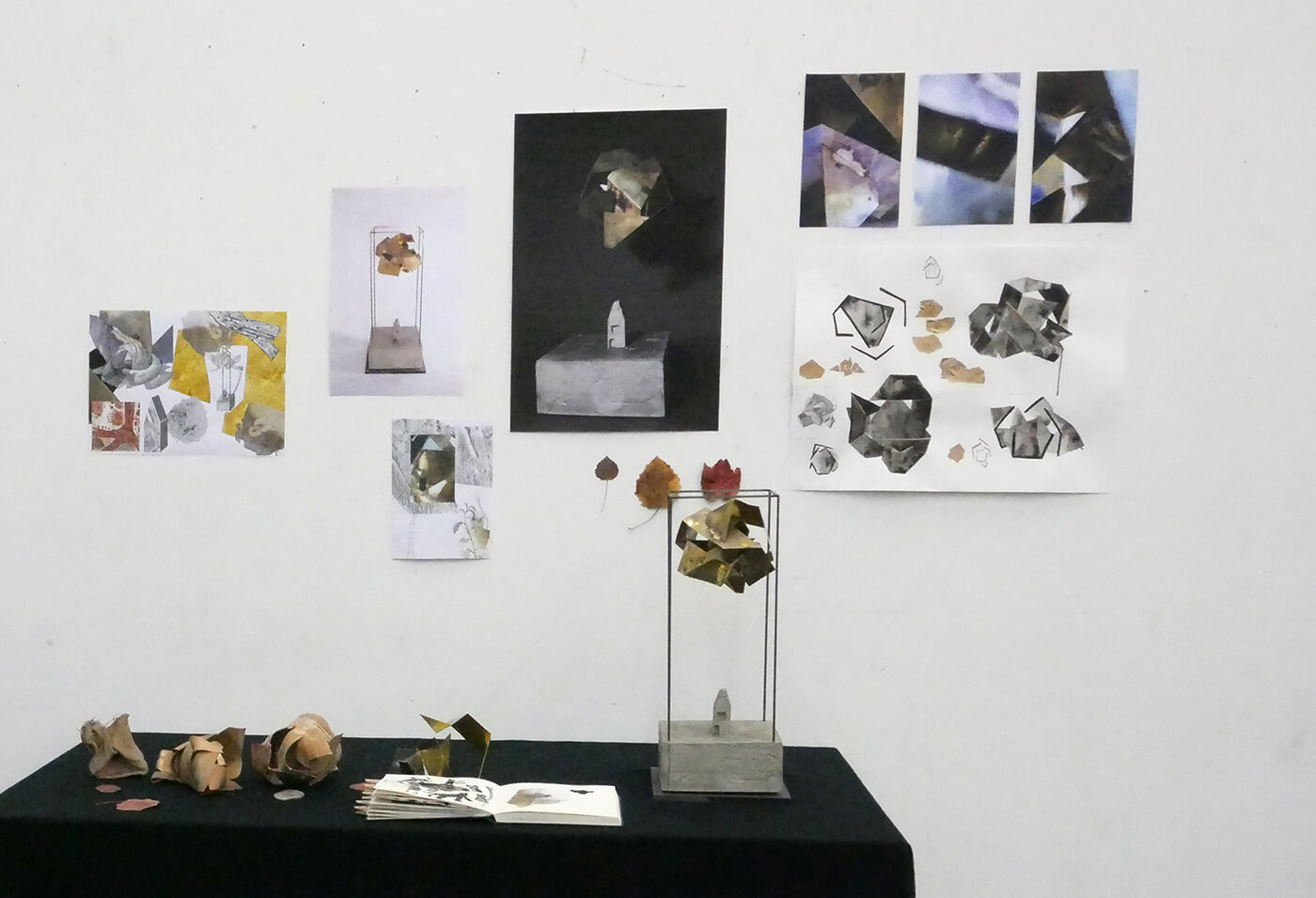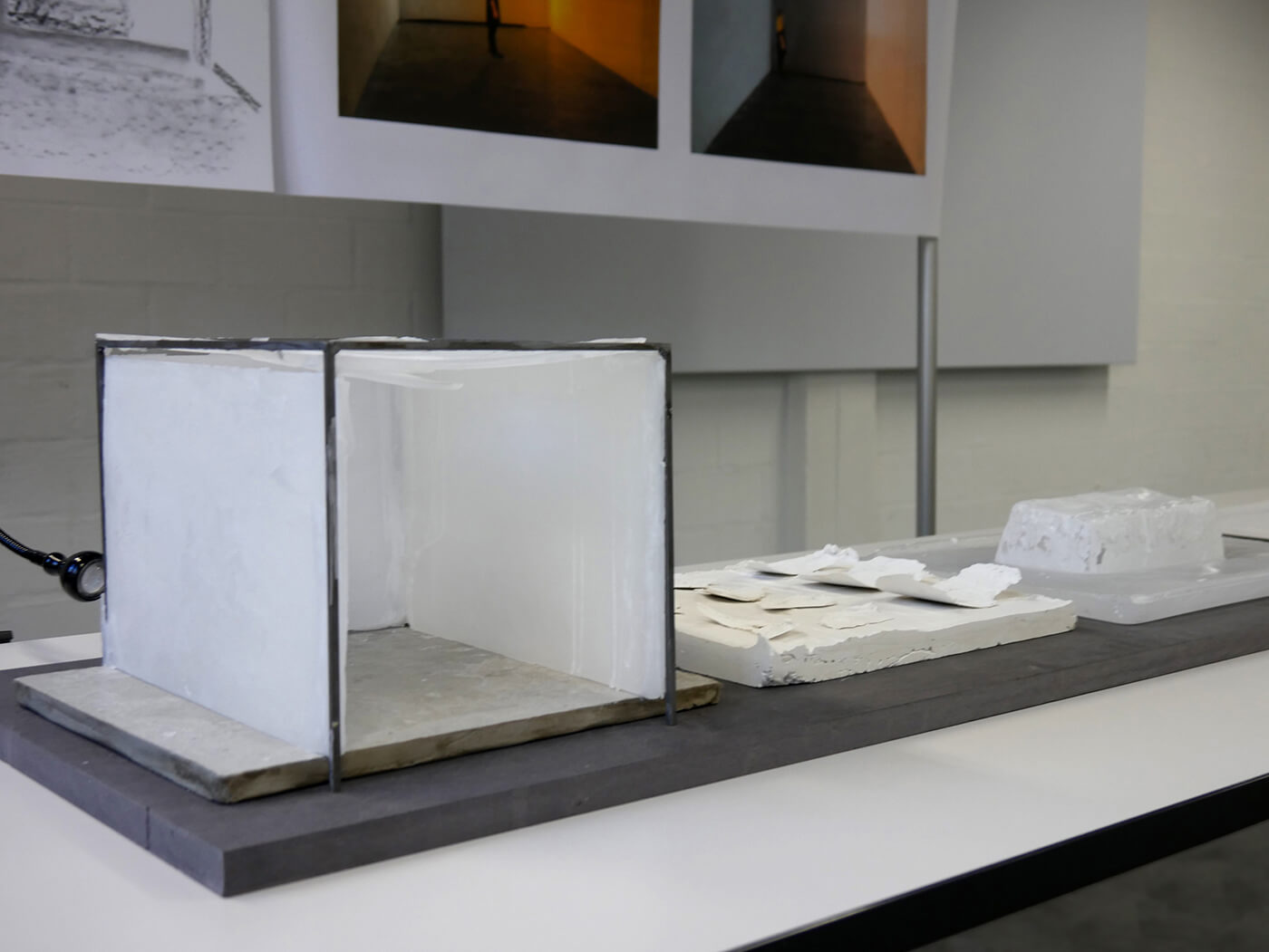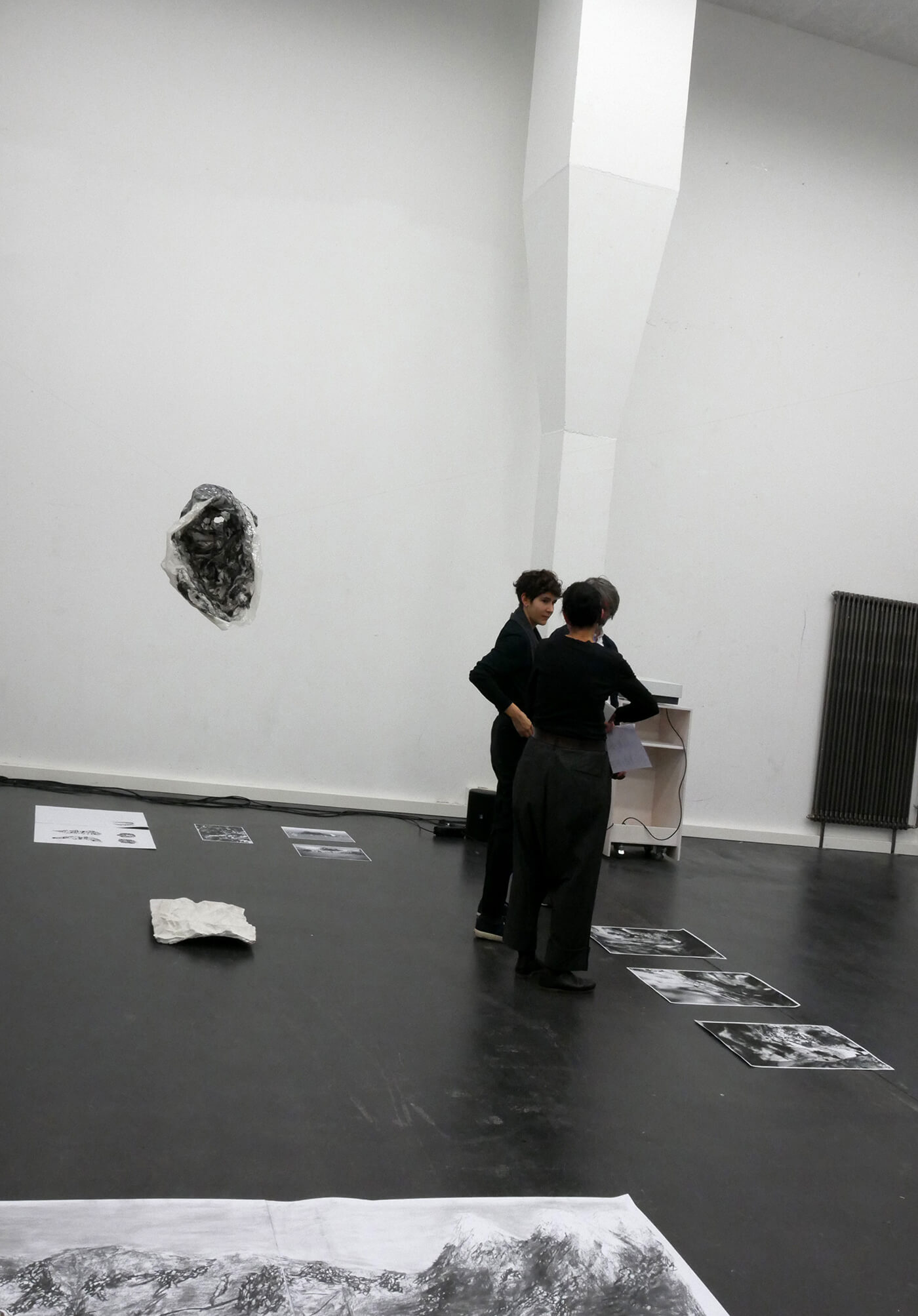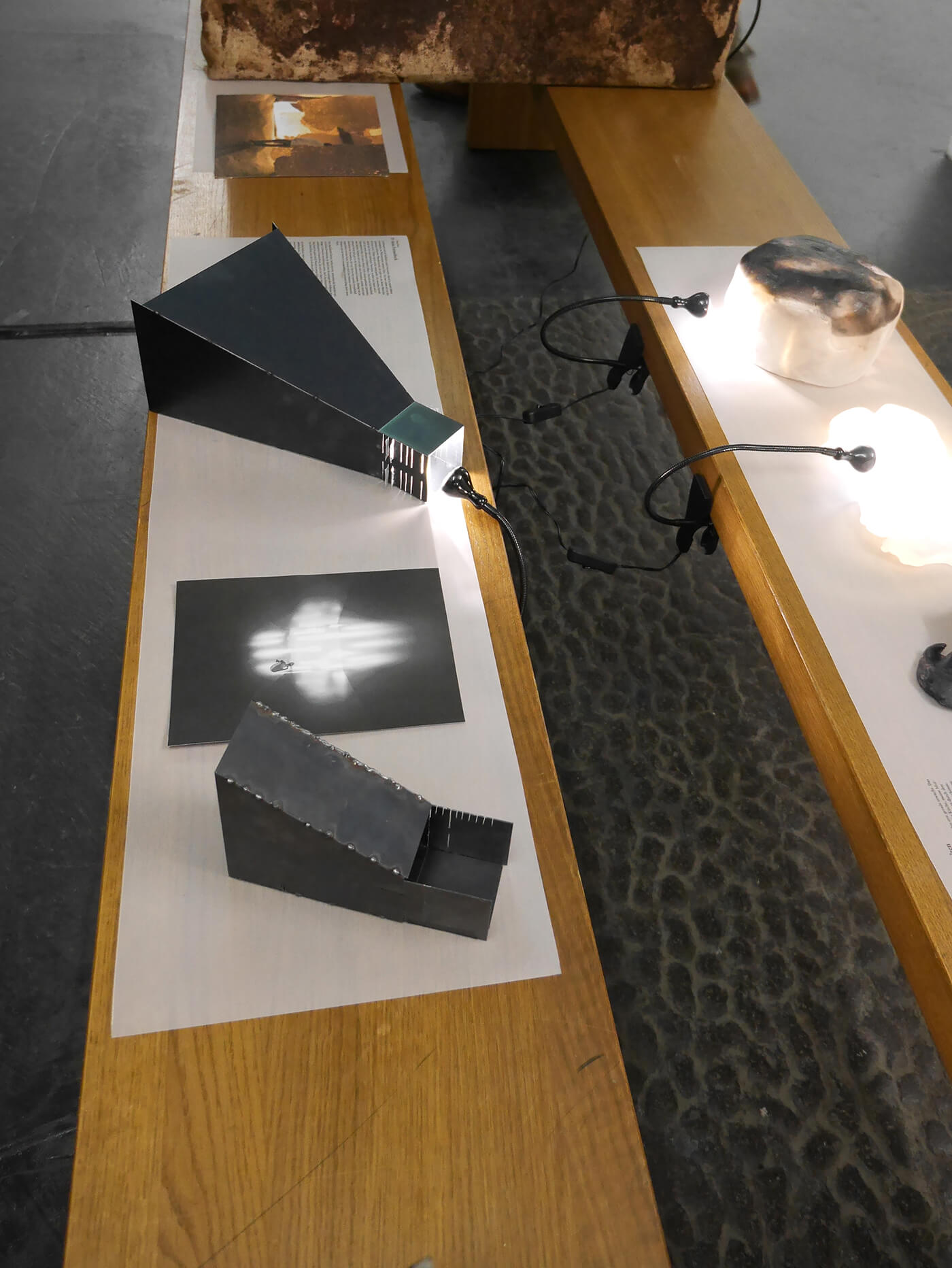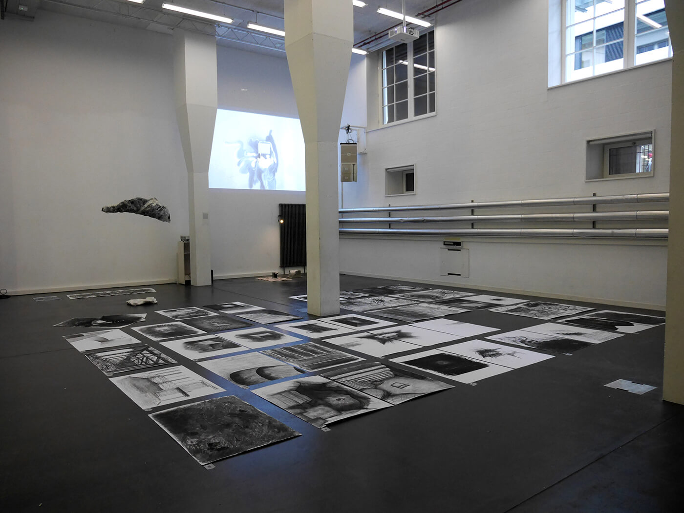 Gelatinehäuser, die zwischen den Zähnen knirschen – schwebende Höhlen – der Raum unter dem Klavier, der sich als Universum entpuppt – abgelagerte Zeitschichten in langen Gängen – Untersuchungen der Dunkelheit und Studien zu Licht– ein Kachelofen, der Harze verfeuert – zerfliessende, zerdrückte, sich auflösende Räume.