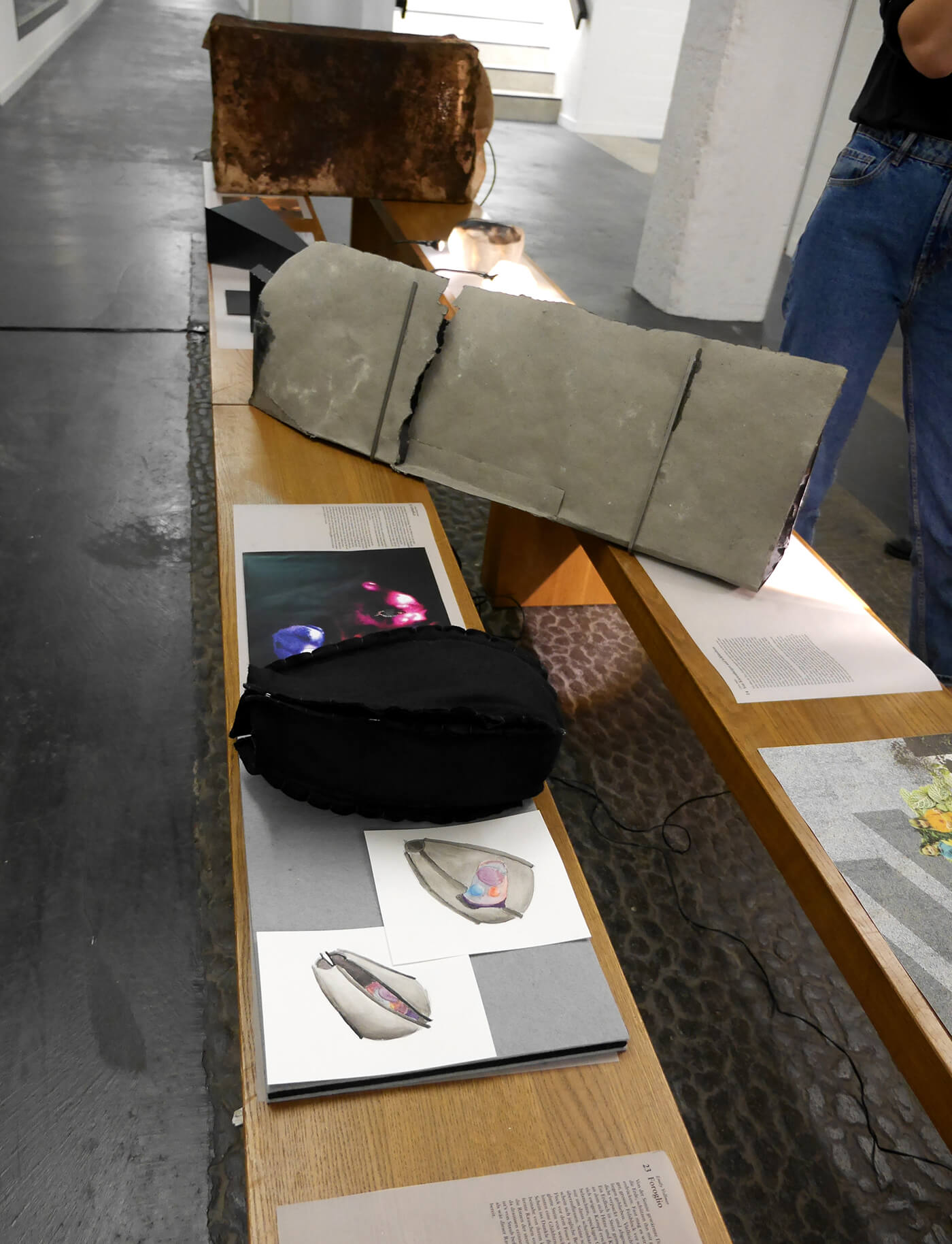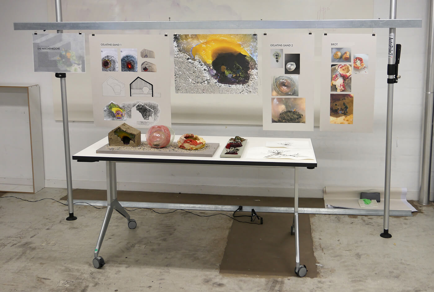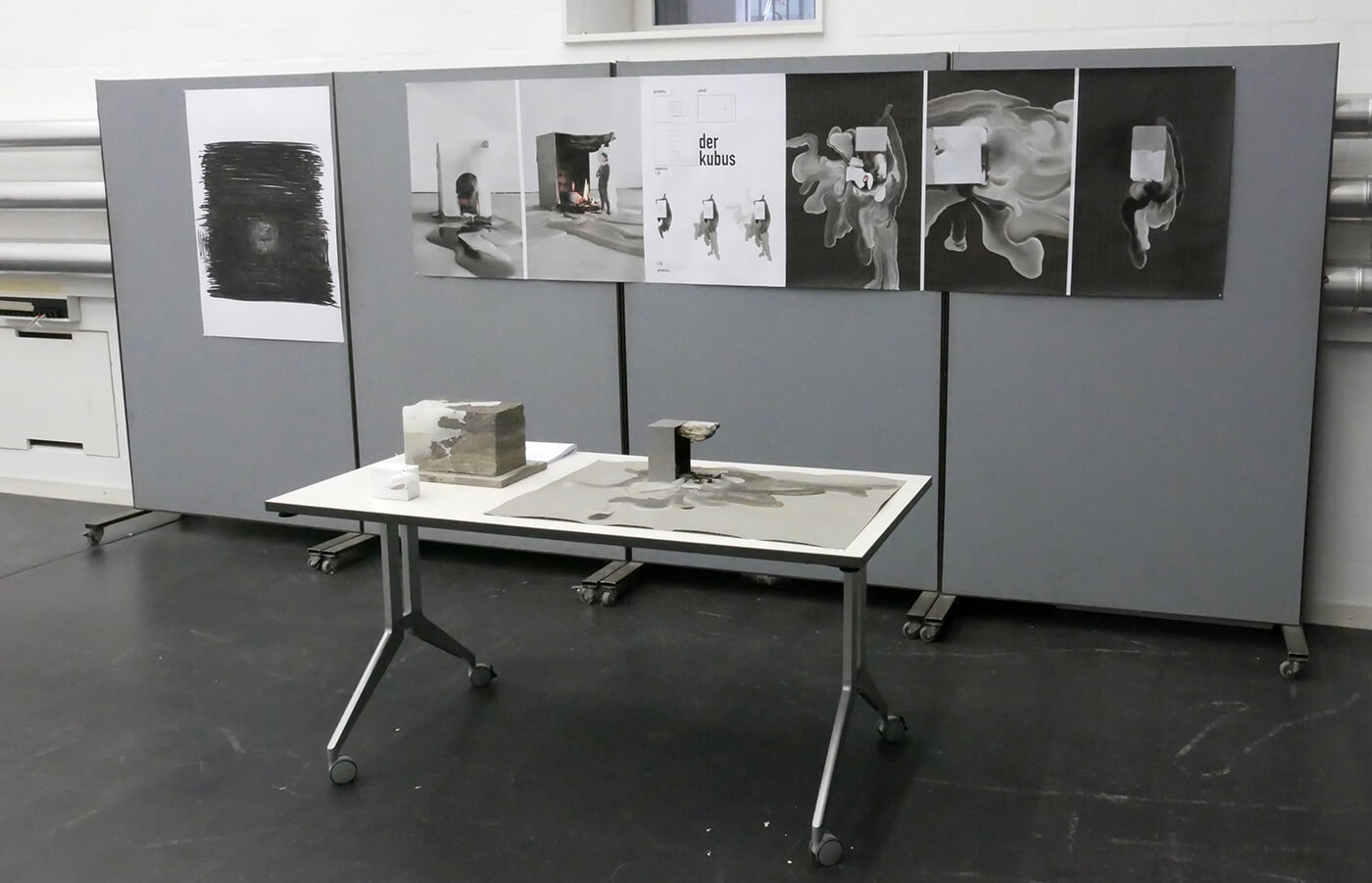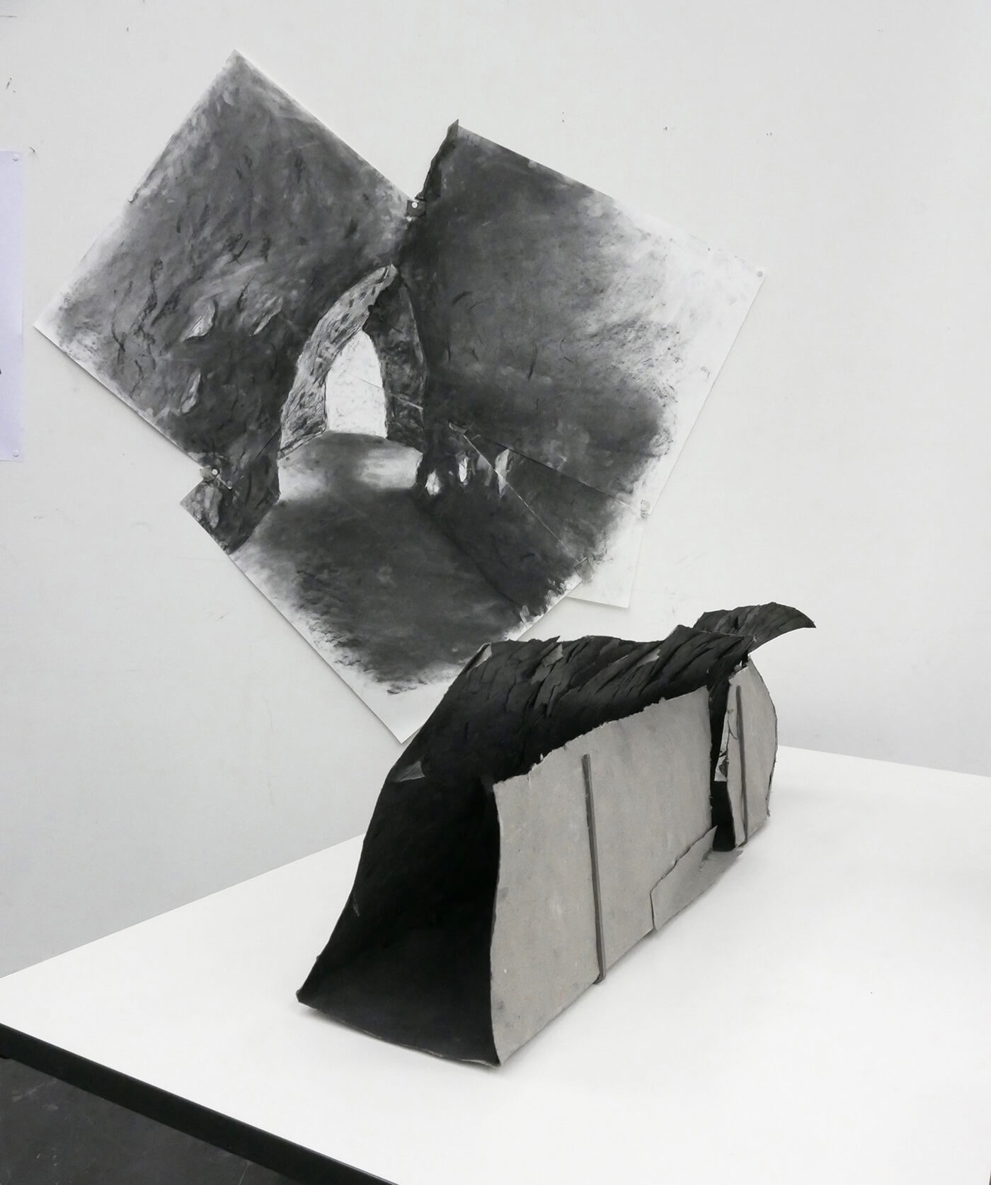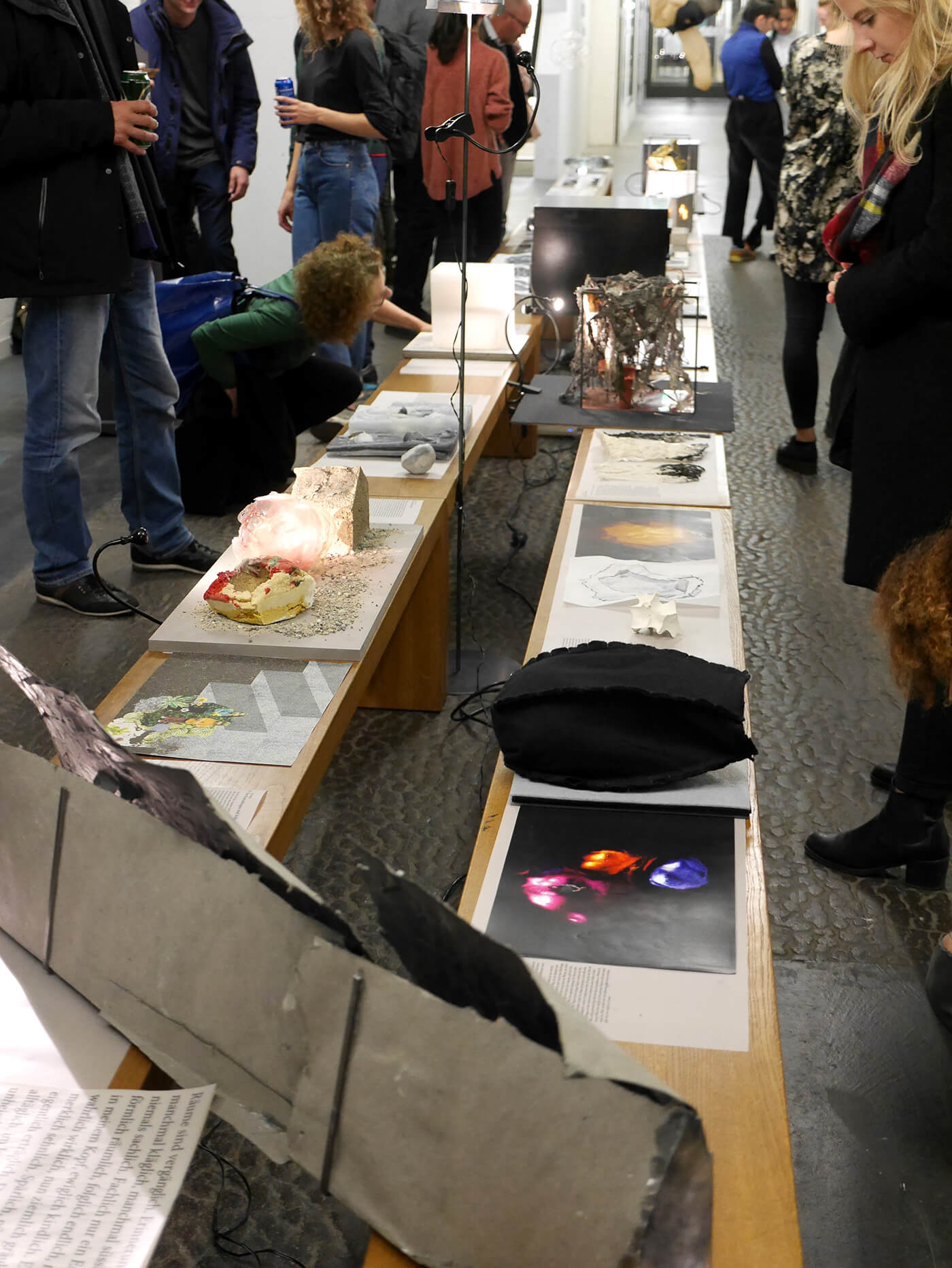 Gelatinehäuser, die zwischen den Zähnen knirschen – schwebende Höhlen – der Raum unter dem Klavier, der sich als Universum entpuppt – abgelagerte Zeitschichten in langen Gängen – Untersuchungen der Dunkelheit und Studien zu Licht– ein Kachelofen, der Harze verfeuert – zerfliessende, zerdrückte, sich auflösende Räume.