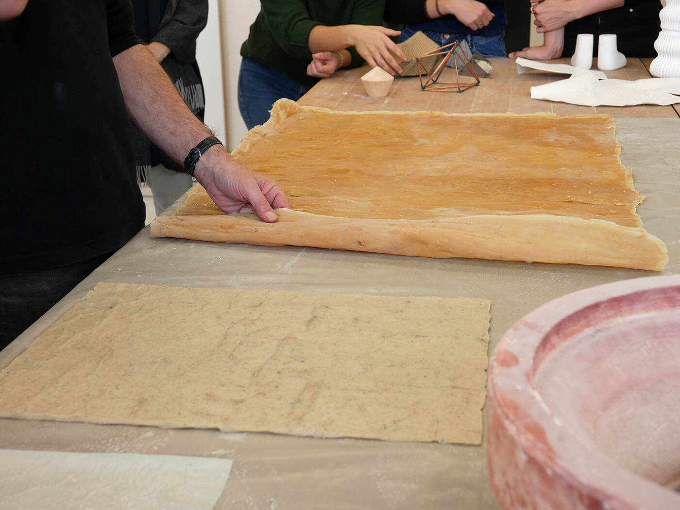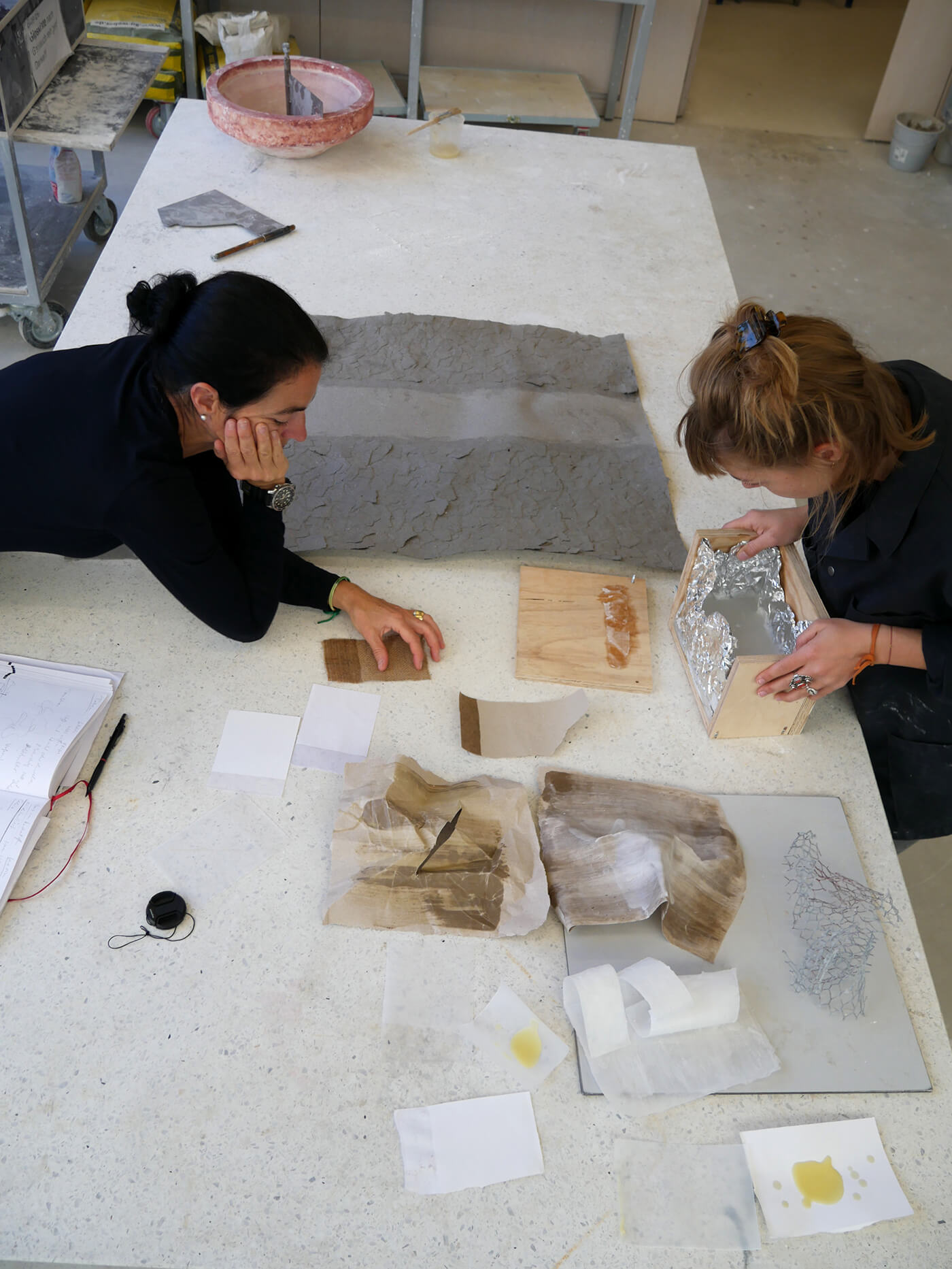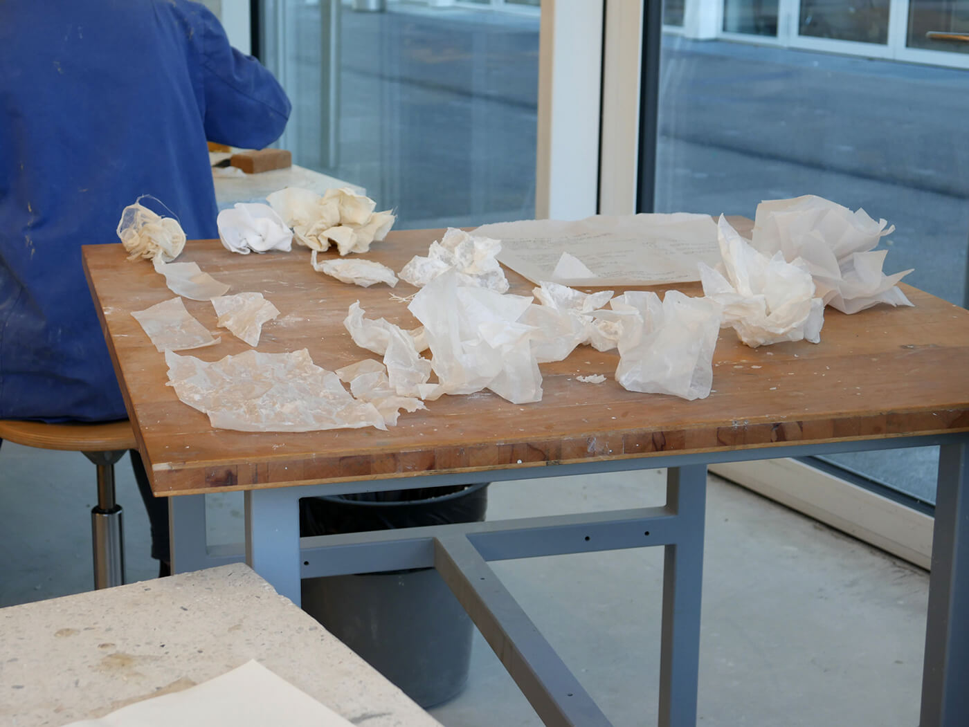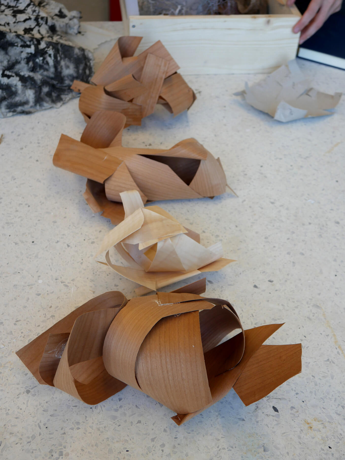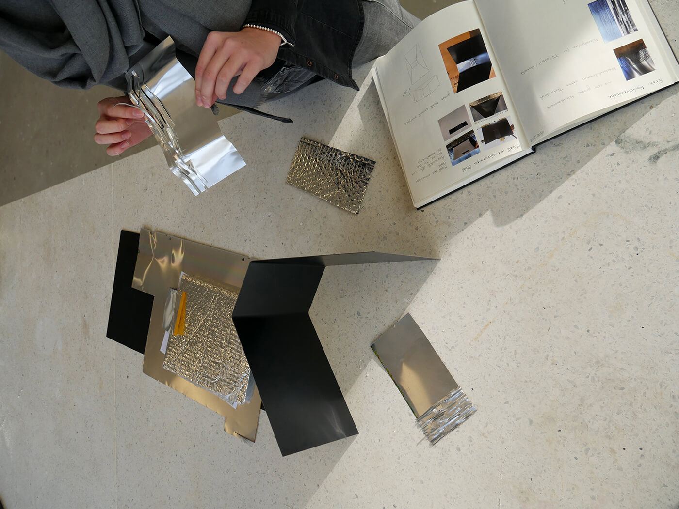 Über einfache Papiermodelle folgt die räumliche Annäherung in zunehmendem Abstraktionsgrad. Die Studierenden arbeiten konzentriert an der Komposition von Form, Proportion, an räumlichen Verhältnissen, an Materialstudien, an sinnlichen Elementen wie Duft, Geräusch und Licht. Das Erproben und Erforschen aller relevanten atmosphärischen Parameter wird geschult und geschärft.